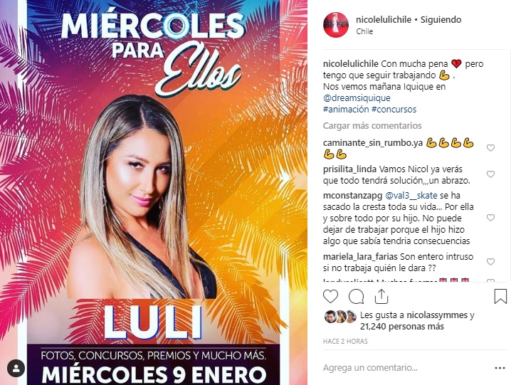 "Con mucha pena, pero tengo que seguir trabajando", escribió escuetamente "Luli" para acompañar el flyer del evento.