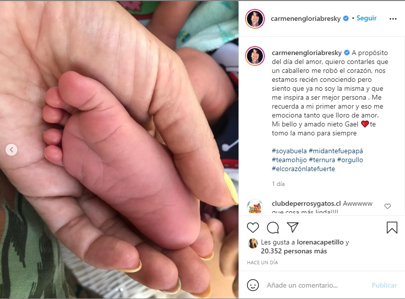 “A propósito del día del amor, quiero contarles que un caballero me robó el corazón", partió escribiendo la artista junto a unas adorables postales de su primer nieto, Gael. "Nos estamos recién conociendo pero siento que ya no soy la misma y que me inspira a ser mejor persona", agregó Bresky.