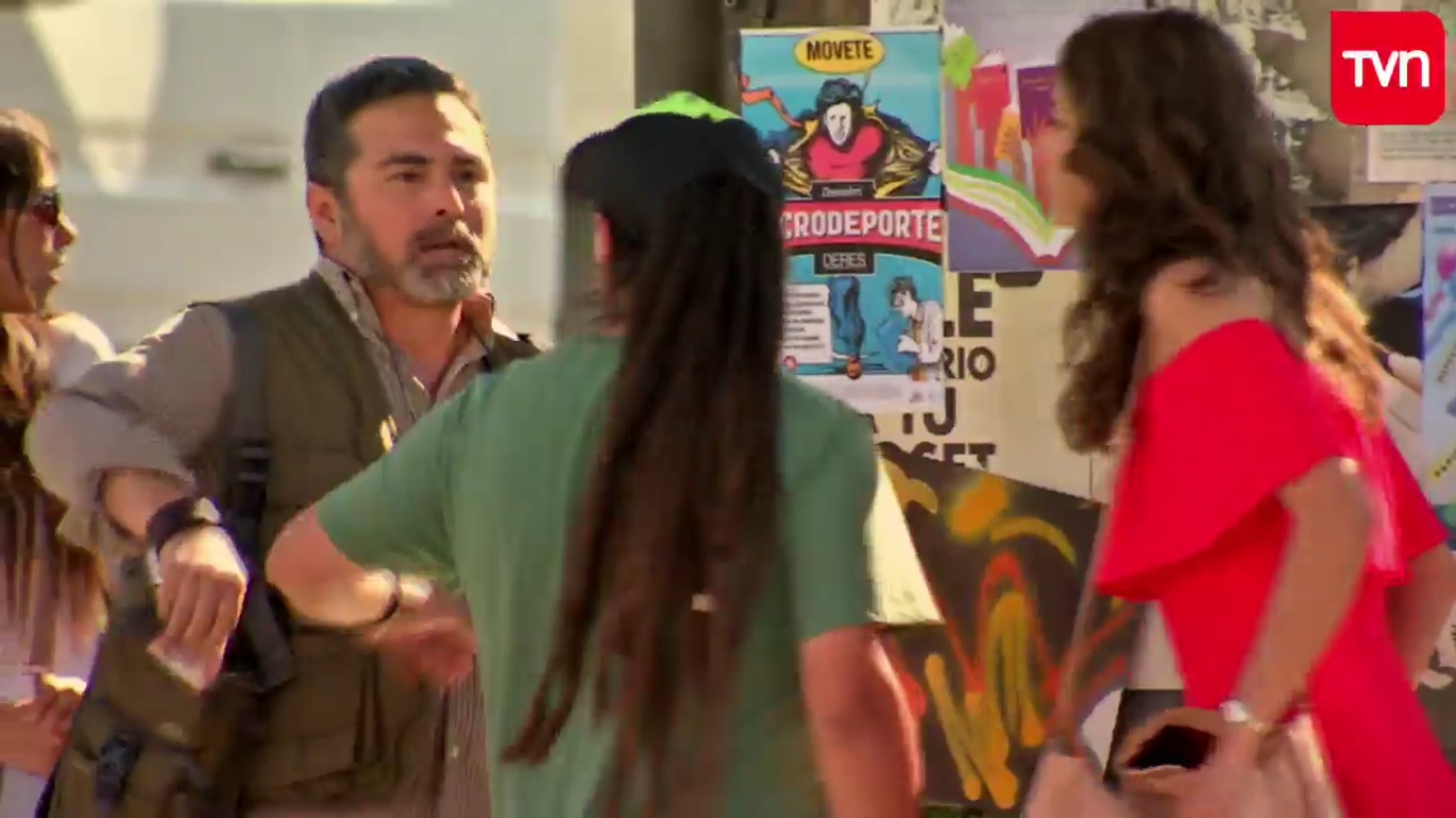 Este hombre comienza a seguirla y le dice: “oiga pero no se me ponga quisquillosa pues. Si usted está en Chile tiene que acostumbrarse al cariño y al piropo", y ella le responde: “No, es que no me parece un piropo, y la próxima vez que me vaya a hablar, míreme a los ojos”. Finalmente comienza un forcejeo y un hombre más joven llega a ayudarla.
