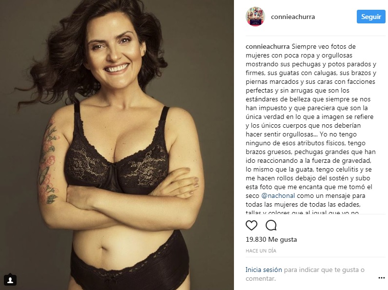 "Yo no tengo ninguno de esos atributos físicos, tengo brazos gruesos, pechugas grandes que han ido reaccionando a la fuerza de gravedad, lo mismo que la guata, tengo celulitis y se me hacen rollos debajo del sostén y subo esta foto que me encanta que me tomó el seco @nachonal como un mensaje para todas las mujeres de todas las edades, tallas y colores que al igual que yo no calzan en ese modelo de belleza impuesta y que sienten que su valor y su validación depende de como se ven, que todos los días sufren sintiendo que no son los suficientemente lindas ni flacas como la sociedad se los exige...abajo los estereotipos, todas somos perfectas, únicas y hermosas con nuestras diferencias, que nadie nos diga como debemos ser o como debemos vernos", termina Connie Achurra.