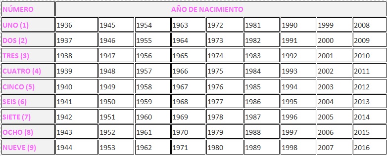 En el último cuadro encontrarás fácilmente el número correspondiente a tu año de nacimiento, que rige tu desarrollo personal. Al compáralo con las características de este año (2017), cuya energía es uno, podrás conocer cuáles son las vibraciones energéticas que te corresponden en el transcurso de este nuevo año y descubrir el mensaje que tiene para tí.