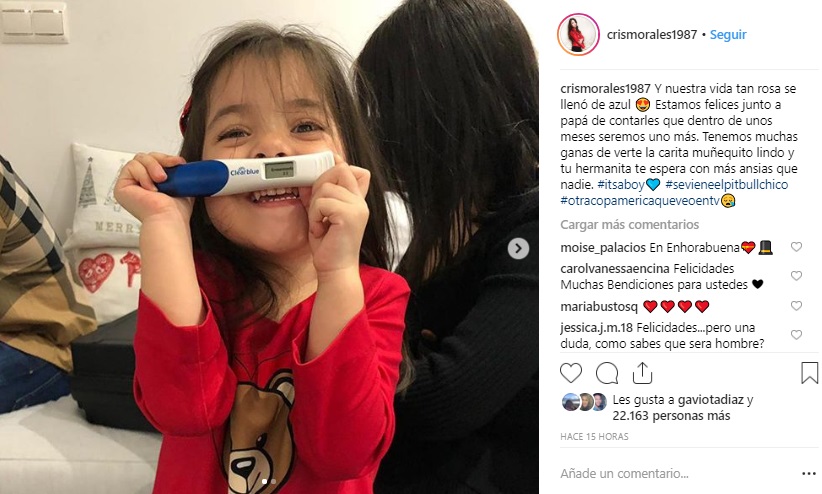 "Y nuestra vida tan rosa se llenó de azul. Estamos felices junto a papá de contarles que dentro de unos meses seremos uno más. Tenemos muchas ganas de verte la carita muñequito lindo y tu hermanita te espera con más ansias que nadie. #itsaboy💙 #sevieneelpitbullchico #otracopamericaqueveoentv", escribió la periodista, revelando que se trata de un varón.