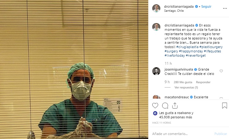 'En esos momentos en que la vida te fuerza a replantearte todo, es un regalo tener un trabajo que te apasiona y te ayuda a sentirte bien... Buena semana para todos!!', escribió Cristián Arriagada para acompañar la publicación.