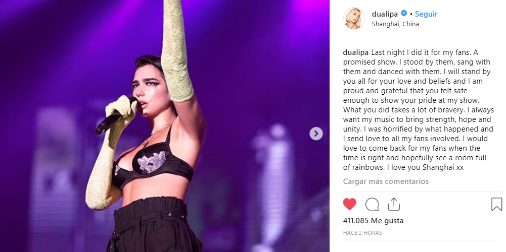 Dua Lipa lloró durante su presentación de su concierto en Shangai, China. Esto luego de que presenciara una triste escena de uno de los fanáticos que se encontraba en el público.