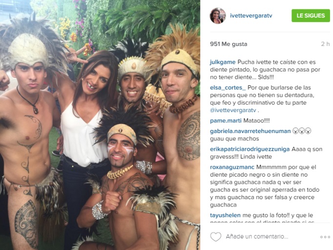 En el estudio se encontraba un grupo de bailarines pascuenses y ella se quiso sacar una foto con ellos. El problema fue su sonrisa, ya que simulando no tener un diente se lo pintó de negro y acompañó la imagen con "#soyguachaca jajajaja".
