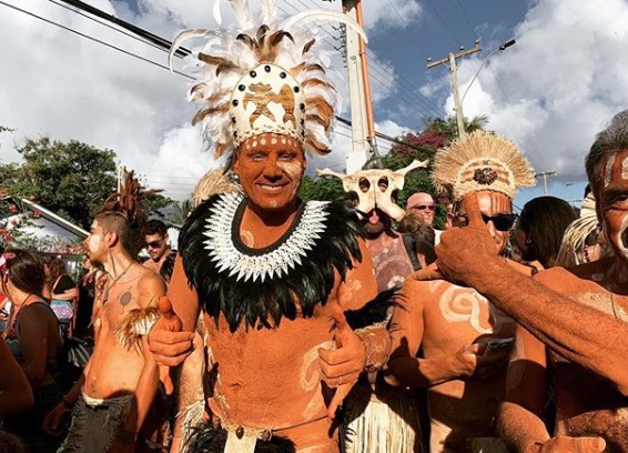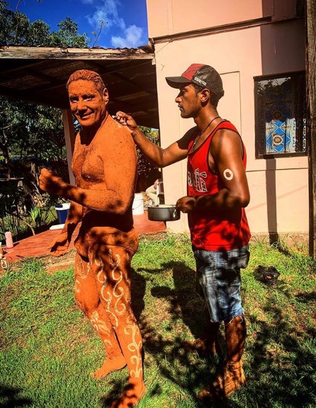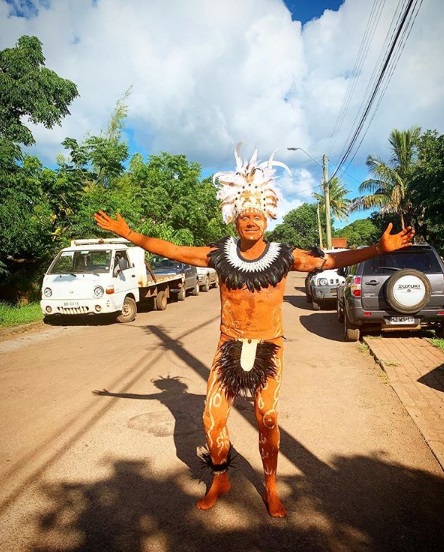 Después de ensayar, Pancho fue a prepararse para la celebración y vestirse acorde al momento. Por eso, el animador se pintó se arcilla todo el cuerpo, se cubrió algunas partes con plumas y se lució con un tocado.