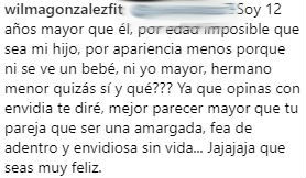 “Parece tu hijo, te ves mayor que él”, le escribió una usuaria, donde Wilma contestó con: “Soy 12 años mayor que él, por edad imposible que sea mi hijo, por apariencia menos, porque ni se ve un bebé. Hermano menor quizás sí, ¿y qué? Ya que opinas con envidia, te diré: mejor parecer mayor que tu pareja, que ser una amargada, fea de adentro y envidiosa sin vida jajaja. Que seas muy feliz”.
