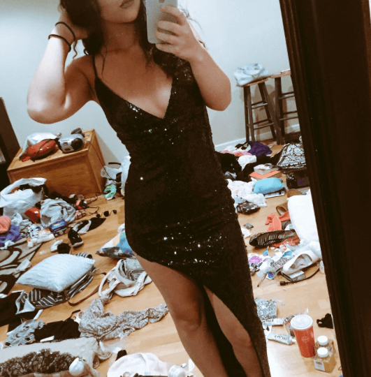 En la imagen aparece frente en su espejo, luciendo un vestido negro y en su nueva casa, a la cual se acaba de cambiar. "Yendo a comer porque necesito una excusa para usar esto", escribió en la fotografía.