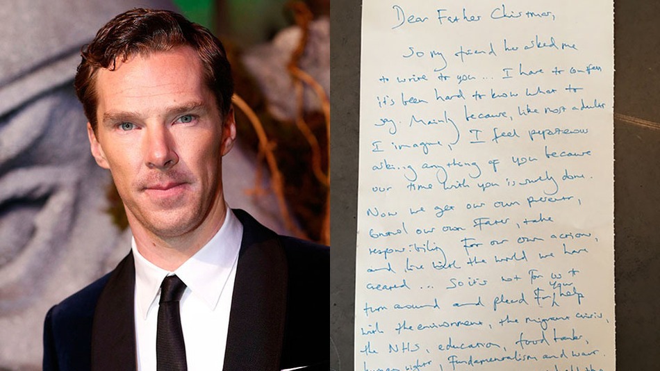 Además, el protagonista de la serie Sherlock Holmes pidió un "regalo para nosotros", refiriéndose a los adultos: "Controlar nuestros propios destinos, asumir las responsabilidades de nuestros actos y vivir en el mundo que hemos creado". Y destacó una petición: "Quiero pedirte que nos ayudes con el medio ambiente, las crisis migratorias, la sanidad pública, la educación, los bancos de alimentos, los Derechos Humanos, el fundamentalismo y las guerras".