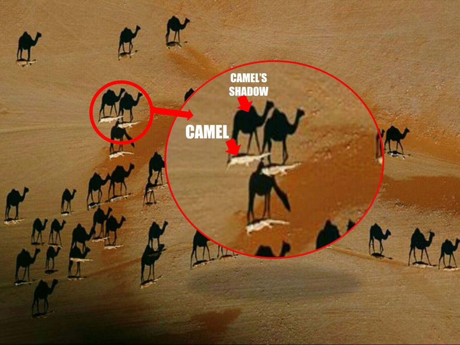 ¡Lee atentamente! Primero, debes saber que los camellos no son lo que crees: lo que estás viendo en la imagen no son los animales en sí, sino las sombras. Sí, la sombra por lo que los animales de verdad son las "líneas" claritas que se ven ahí.
