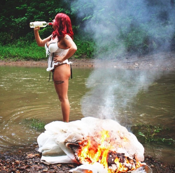A través de las redes sociales, la mujer decidió mostrar que se sentía liberada y decidió quemar su vestido de novia y así celebrar que ahora comenzará una nueva vida. Tomando una botella de vino, se ve el vestido quemado simbolizando el fin de su matrimonio.