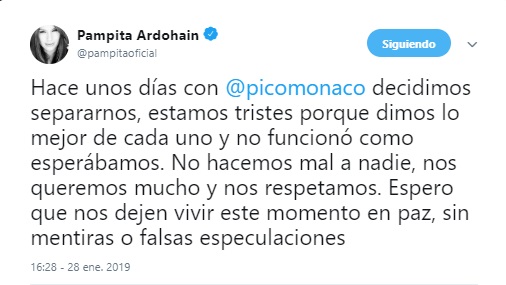 "Hace unos días con @picomonaco decidimos separarnos, estamos tristes porque dimos lo mejor de cada uno y no funcionó como esperábamos. No hacemos mal a nadie, nos queremos mucho y nos respetamos".