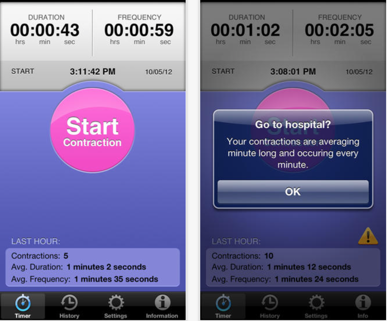 ¡El momento tan esperado llegó! Cuando estés con contracciones, lo más probable es que no te acuerdes de tu teléfono, pero si lo haces, debes mirar esta aplicación que cuenta con un cronómetro para que presiones un botón que registrará el momento del inicio y del fin, ayudándote a saber cuánto duraron tus contracciones.