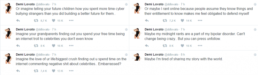 Finalmente su desahogo finalizó en: "Imagínate que el amor de tu vida o la persona que te gusta se enterara de que pierdes tu tiempo en Internet enviándole comentarios negativos a celebridades. ¿Te daría vergüenza? Imagínate que tus padres descubrieran que has malgastado tu tiempo trolleando a celebridades que ni siquiera conoces en Internet. O imagínate tener que contarles a tus futuros hijos cómo pasabas más tiempo haciéndole bullying a completos desconocidos en Internet en vez de intentando construir un futuro mejor".