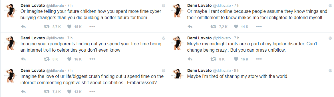 Finalmente su desahogo finalizó en: "Imagínate que el amor de tu vida o la persona que te gusta se enterara de que pierdes tu tiempo en Internet enviándole comentarios negativos a celebridades. ¿Te daría vergüenza? Imagínate que tus padres descubrieran que has malgastado tu tiempo trolleando a celebridades que ni siquiera conoces en Internet. O imagínate tener que contarles a tus futuros hijos cómo pasabas más tiempo haciéndole bullying a completos desconocidos en Internet en vez de intentando construir un futuro mejor".