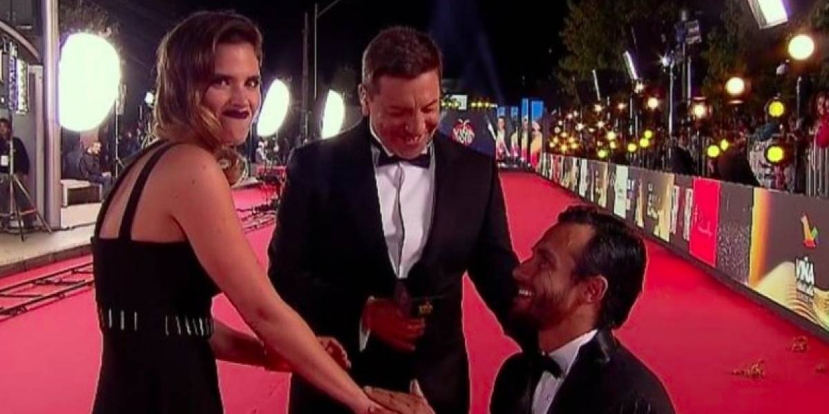 Después de darle un beso, la presentó al público, a quien pidió permiso para 'hacerle la pregunta', donde se puso de rodilla y con anillo en mano su pareja le respondió con un "Sí".