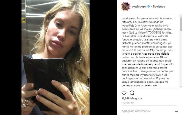 Sobre el aumento del busto que se hizo a los 17 años, dijo que se las sacó hace poco. “Así que mi gente, para que no se estresen preguntándome en cada foto qué me hice, les contaré si algún día me hiciera algo … tamos ? Jajaja”, finalizó.