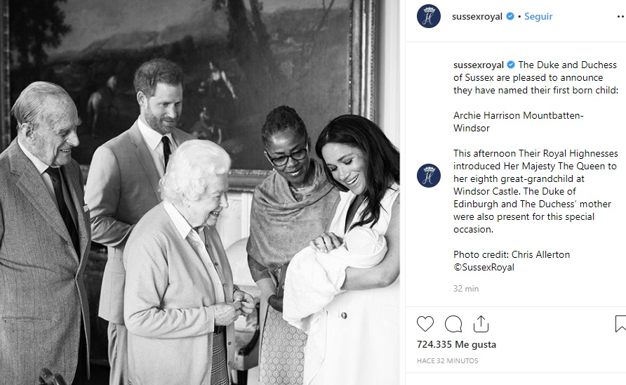 "El duque y la duquesa de Sussex tiene el placer de anunciar el nombre de su primer hijo: Archie Harrison Mountbatten-Windsor", escribieron en la red social, donde el anuncio estuvo acompañado con una imagen de los duques presentando al bebé a sus bisabuelos, la Reina Isabel II y a Felipe de Edimburgo, en compañía también de la madre de Meghan, Doria Ragland.