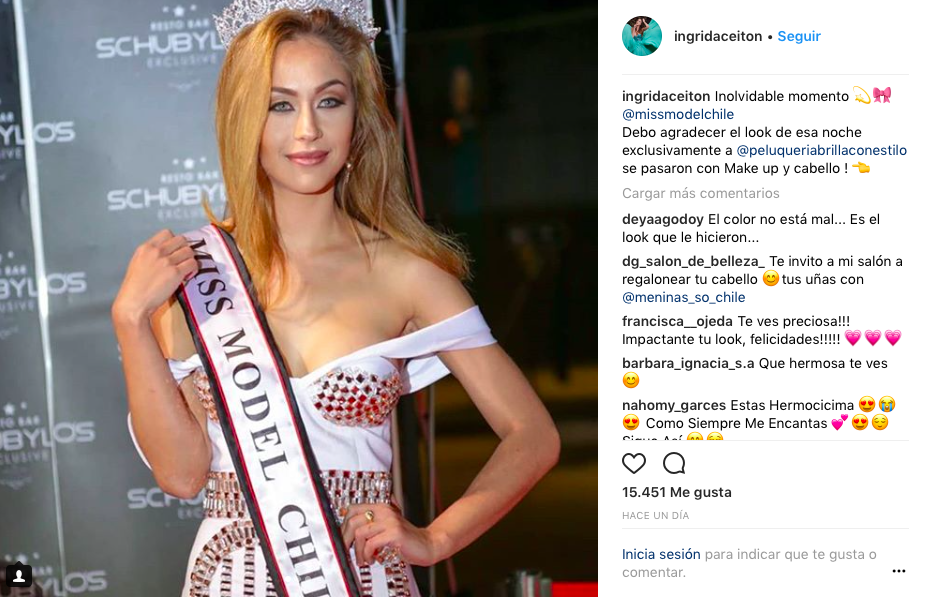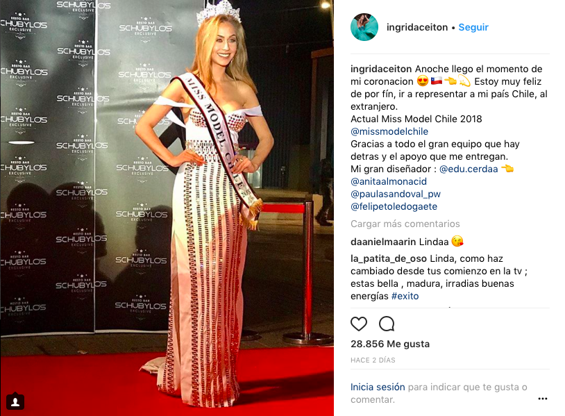A través de su cuenta de Instagram, la modelo Ingrid Aceitón anunció que fue coronada como "Miss Model Chile", por lo que irá a representar a nuestro país en un concurso internacional de belleza.