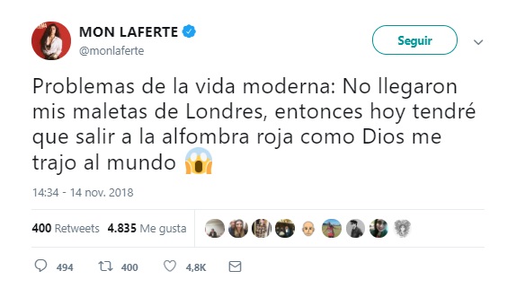 "Problemas de la vida moderna: No llegaron mis maletas de Londres, entonces hoy tendré que salir a la alfombra roja como Dios me trajo al mundo", escribió hace unas horas Mon Laferte en su red social.
