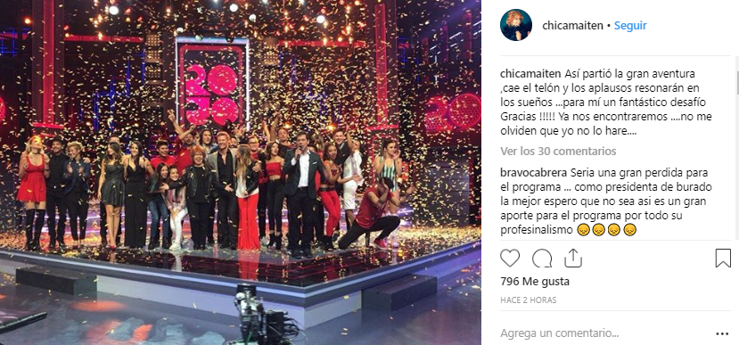 La bailarina compartió la noticia en su cuenta de Instagram, y agradeció la oportunidad de haber sido parte del espacio. "Así partió la gran aventura... cae el telón y los aplausos resonarán en los sueños... para mí un fantástico desafío. ¡Gracias! Ya nos encontraremos... no me olviden que yo no lo haré".