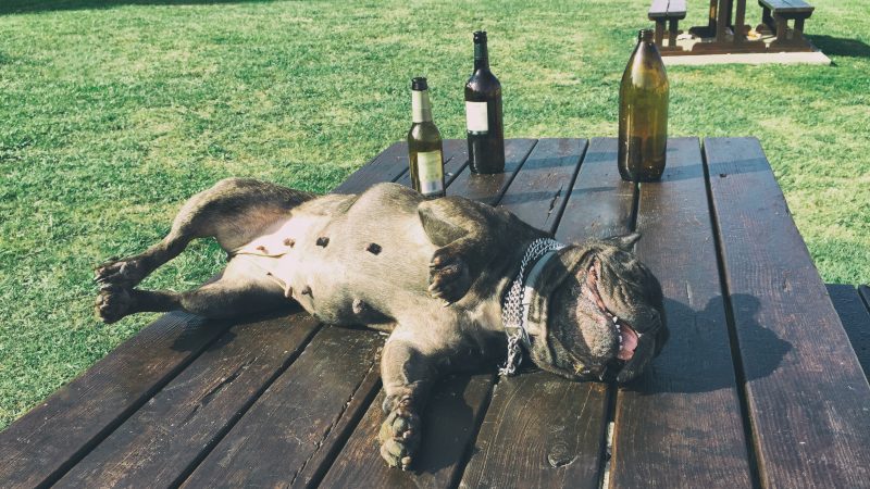 Claramente el perro no logra beber alcohol pero su tamaño y su poca conciencia del peso que tiene es que lo llevan a subirse arriba de este joven.