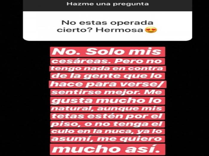 “No. Solo mis cesáreas. Pero no tengo nada en contra de la gente que lo hace para verse/sentirse mejor. Me gusta mucho lo natural, aunque mis tetas estén por el piso, o no tenga el culo en la nuca, ya lo asumí, me quiero mucho así”, respondió la actriz de 26 años.