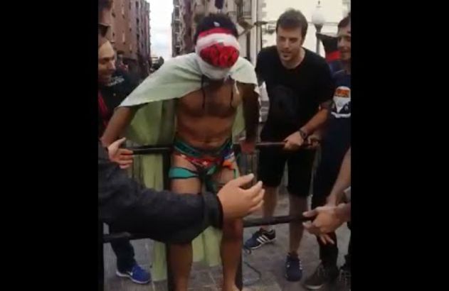 Los invitados de la despedida le vendaron los ojos y le hicieron creer al novio que iba a saltar al vacío desde un puente, junto a una vía del tren. El joven confío en sus amigos y muy seguro iba a saltar, pero a los segundos se da cuenta que solo es la calle, lo que causó la risa de todos los espectadores.