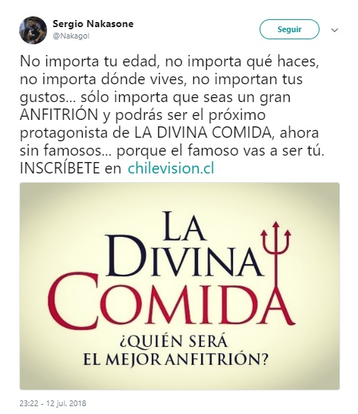 "No importa tu edad, no importa qué haces, no importa dónde vives, no importan tus gustos... Sólo importa que seas un gran anfitrión y podrás ser el próximo protagonista de "La divina comida", ahora sin famosos, porque el famoso vas a ser tú", publicó Nakasone a través de su cuenta en Twitter, el ex cerebro de los realities de Canal 13 y que en Chilevisión trabaja paralelamente en "Bake off Chile".