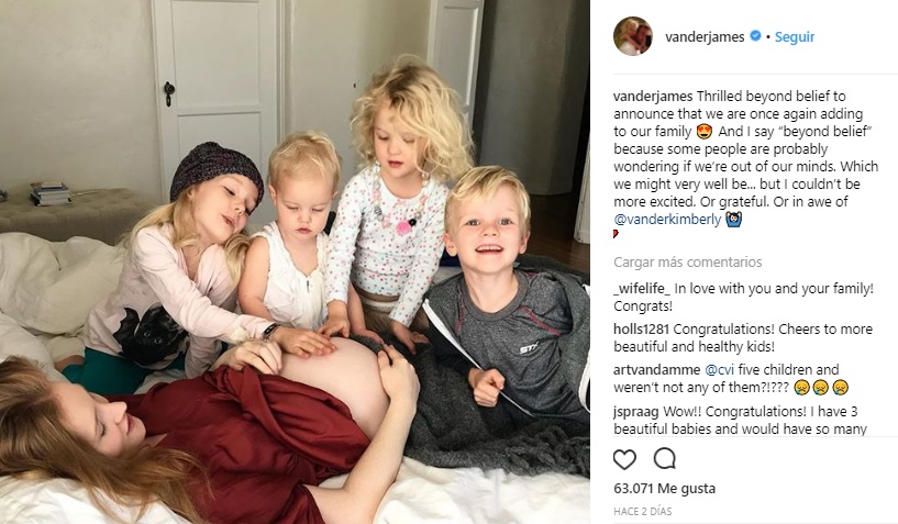 Para dar la noticia, el intérprete compartió en Instagram una foto de su esposa Kimberly mostrando su vientre desnudo junto a sus cuatro hijos: Olivia de siete años, Joshua de cinco, Annabel de cuatro y Emilia de casi dos años.