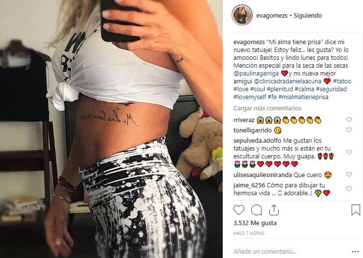 “Mi alma tiene prisa” dice mi nuevo tatuaje! Estoy feliz... les gusta? Yo lo amoooo! Besitos y lindo lunes para todos! Mención especial para la seca de las secas @paulinagarriga", escribió Eva Gómez para acompañar la publicación.