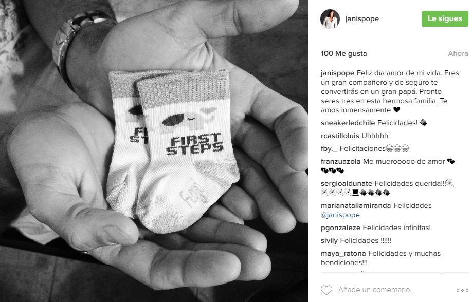 "Feliz día amor de mi vida. Eres un gran compañero y de seguro te convertirás en un gran papá. Pronto seres tres en esta hermosa familia. Te amos inmensamente", escribió Janis junto a una foto en la que aparecen unos calcetines de bebé.