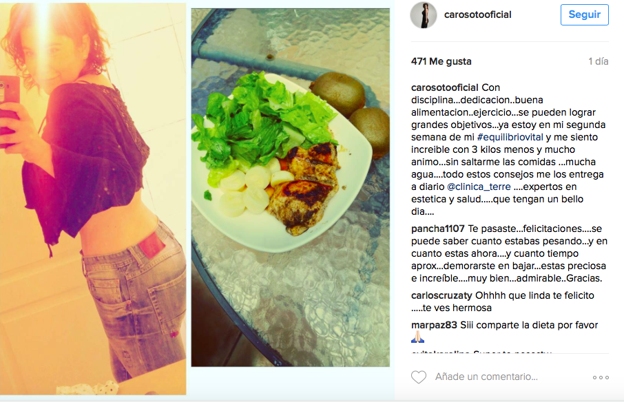 "Con disciplina...dedicación..buena alimentacion..ejercicio...se pueden lograr grandes objetivos...ya estoy en mi segunda semana de mi #equilibriovital y me siento increible con 3 kilos menos y mucho animo...sin saltarme las comidas ...mucha agua....todo estos consejos me los entrega a diario @clinica_terre ....expertos en estetica y salud.....que tengan un bello día", escribió junto a la imagen.