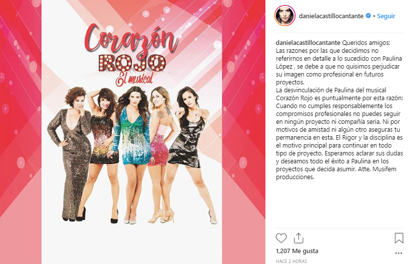 "Queridos amigos: las razones por las que decidimos no referirnos en detalle a lo sucedido con Paulina López se deben a que no quisimos perjudicar su imagen como profesional en futuros proyectos. La desvinculación de Paulina del musical Corazón Rojo es puntualmente por esta razón: cuando no cumples responsablemente los compromisos profesionales no puedes seguir en ningún proyecto ni compañía seria, ni por motivos de amistad, ni algún otro aseguras tu permanencia en ésta", indicaron.