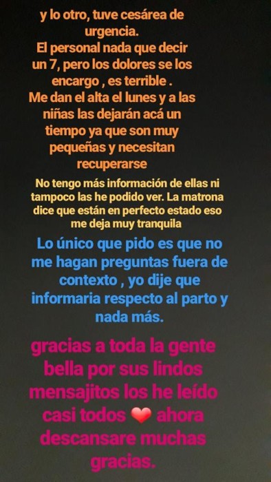 Tras este lamentable hecho, y luego de que médicamente no pudieran hacer nada para retrasar el parto, sus hijas, a quienes llamó Agustina y Amparo, nacieron durante la madrugada este sábado a eso de las 00:50 horas. Camila compartió la bella noticia también a través de redes sociales, donde comentó que fueron muy pequeñitas, dado que nacieron antes de tiempo, y que se encuentra en recuperación.