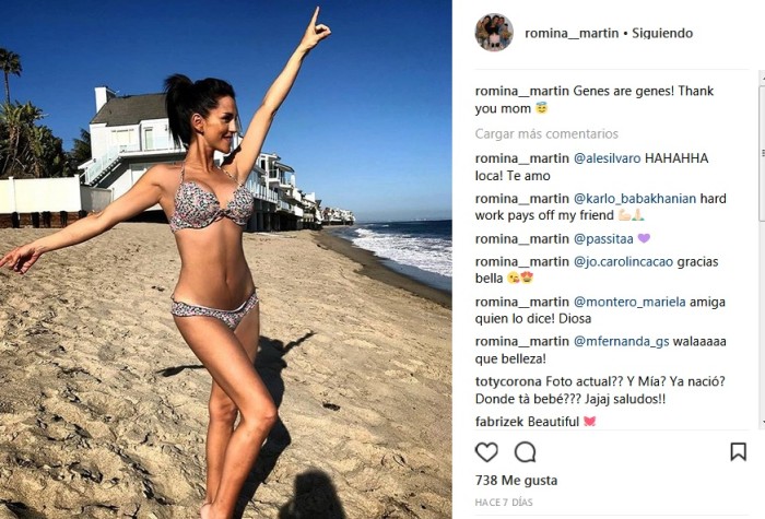 Además de las felicitaciones por su hija, Romina sorprendió por su escultural figura a menos de un mes de haber dado a luz. La ex participante de "Pelotón" confesó que subió 12 kilos durante su embarazo, el que comenzó con 48. "Yo sumé 12 kilos durante mi embarazo y a los tres días de haber tenido a Mía bajé siete. Empecé el embarazo con 48 y hoy a tres semanas de ser mamá estoy en 52", comentó.