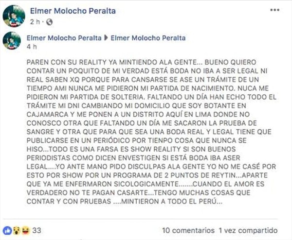 "Quiero contar un poquito de mi verdad. Esta boda no iba a ser legal, ni real. ¿Saben por qué? Porque para casarte se hace un trámite de un tiempo, a mí nunca me pidieron mi partida de nacimiento, nunca me pidieron mi partida de soltería", denunció el hombre sobre el programa de Magaly Medina, donde se televisó la boda.