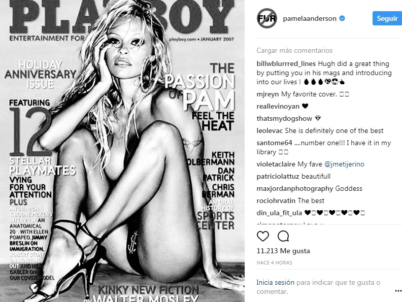 En el video, Pamela Anderson rompe en llanto mientras dice la frase "Adiós Hef". Asimismo, la "chica playboy" escribió un mensaje que decía: "Tengo tantos pensamientos, no tengo cerebro ahora para editar. Soy lo que soy por usted. Me enseñó todo acerca de la libertad y el respeto. Fuera de mi familia, era la persona más importante de mi vida. Me diste la vida… La gente me decía todo el tiempo que yo era su favorita… Estoy conmovida. Pero estaba ya mayor, la espalda le dolía mucho. La última vez que lo vi, utilizabas un andador. No querías que lo viera. No podías escuchar. Tenía un pedazo de papel en el bolsillo que me mostró: tenía mi nombre Pamela con un corazón".
