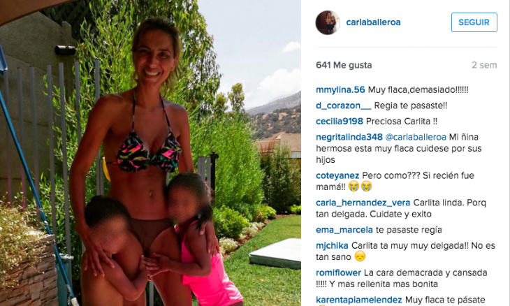La ex “Chica Morandé”, por estos días está feliz disfrutando junto a su familia y así lo demuestra constantemente a través de sus fotos, sin embargo, cada vez que comparte una, comentarios como: “Mi niña está muy flaca, cuidese por sus hijos”, “Carlita muy delgada, no es tan sano” o “Más rellenita, más bonita”, demuestran la preocupación de quienes la siguen. Pero la verdad, es que ella misma se ha encargado de mostrar su rutina diaria de ejercicios en su casa que la mantienen así de bien.