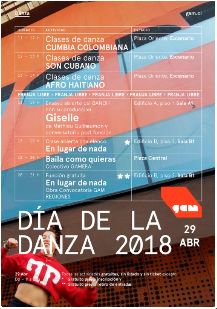 Este domingo 29 de abril es el Día Internacional de la Danza y el Centro Cultural Gabriela Mistral (GAM) lo ha querido celebrar con actividades gratuitas desde las 11:00 a las 21:00 horas. El establecimiento ofrecerá durante el día una amplia variedad de clases que incluye ritmos como la cumbia colombiana y el afro haitiano, entre otros.