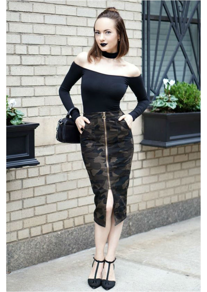 - Dale un toque “dark” a tu outfit, pero con mucho glamour. Opta por una pencil pusher con estampado militar y combínala con un sexy body negro.