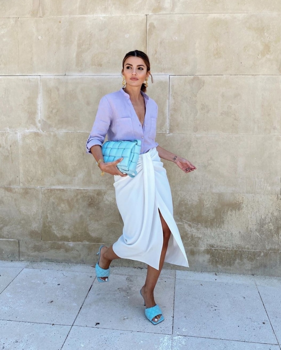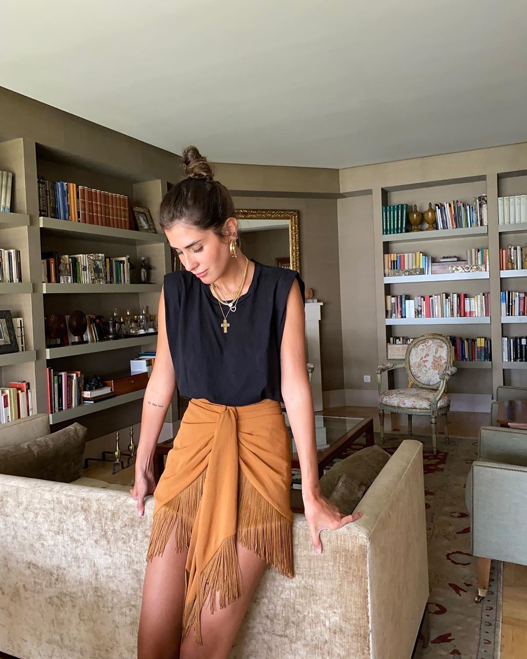 En corte midi -a media pantorrilla-, la falda pareo adquiere también un aire elegante. Sobre todo si la combinas con unos zapatos de taco alto y la eliges en un color neutro.
