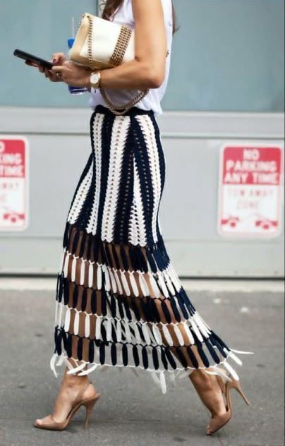 Las faldas de crochet suelen ser blancas, beige o de colores claros, aunque también podrás encontrarlas en otros tonos. Por ejemplo, en blanco con negro.
