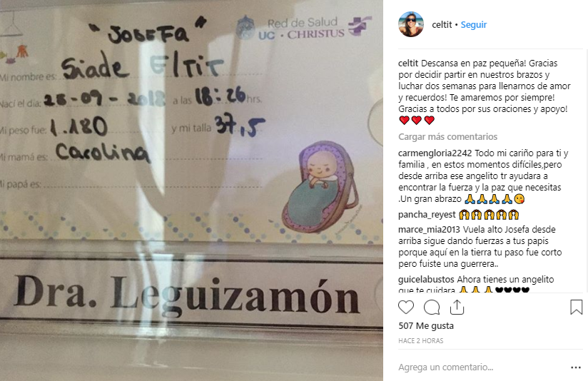 "Descanza en paz pequeña. Gracias por decidir partir en nuestros brazos, y luchar dos semanas para llenarnos de amor y recuerdos. Te amaremos por siempre. Gracias a todos por sus oraciones y apoyo", escribió Eltit en su cuenta de Instagram.