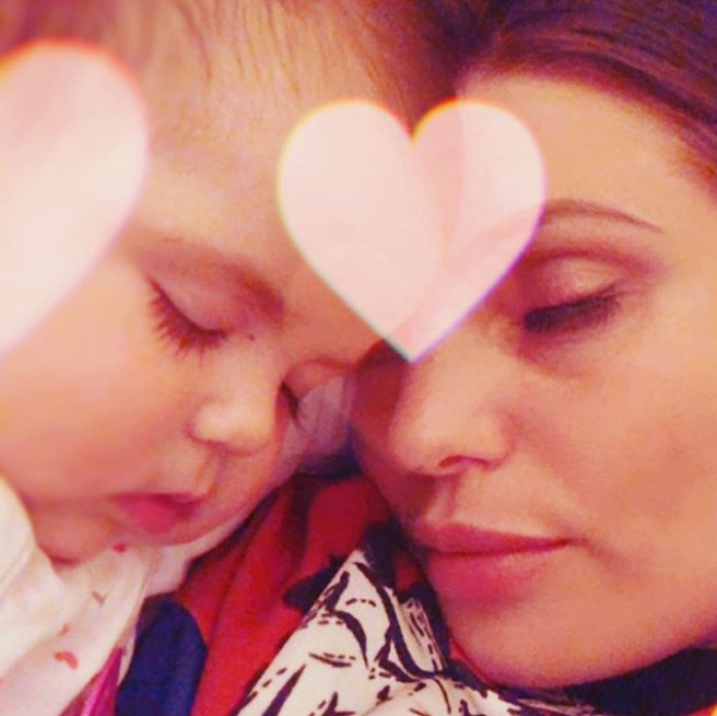 En la foto, aparece junto a la pequeña, recostada en una cama mientras duerme tranquilamente. La imagen tiene un filtro de corazones.