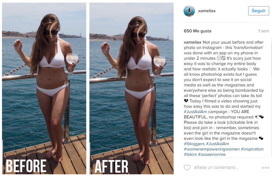 Para llevar a cabo la prueba publicó en su cuenta de Instagram dos fotos en bikini, una en versión original y otra editada. Aunque señaló que: "Personalmente prefiero como veo sin retoques", quiso hacer este experimento con el fin de incentivar a las mujeres a aceptar su cuerpo tal como es. Aunque las diferencias físicas gracias a esta aplicación quedaron en evidencia, Amelia reconoció que lo que hace especial a las mujeres, es eso que las diferencia de las otras.