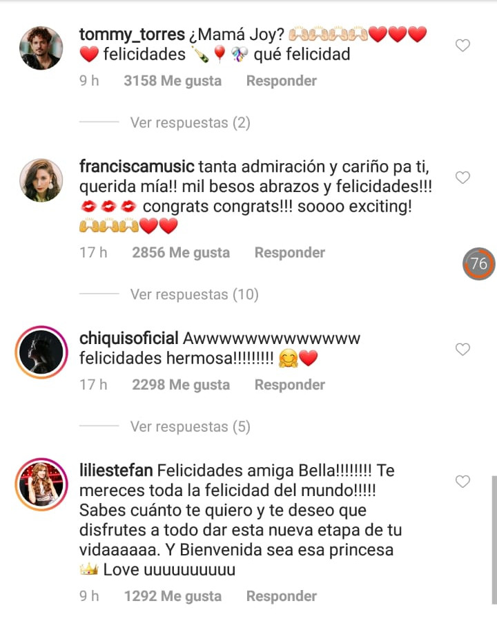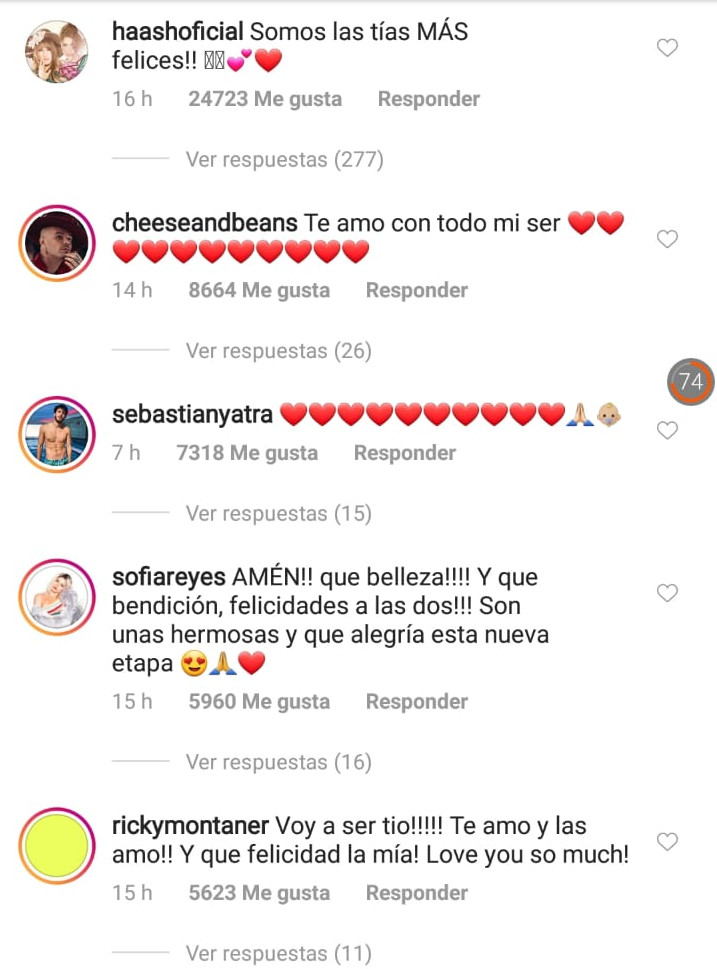 “Voy a ser tío!!!!! Te amo y las amo!! Y que felicidad la mía! Love you so much”, expresó Ricardo Montaner, mientras que la artista nacional Francisca Valenzuela comentó: “Tanta admiración y cariño pa ti, querida mía!! mil besos abrazos y felicidades!!! congrats congrats!!! soooo exciting!”.