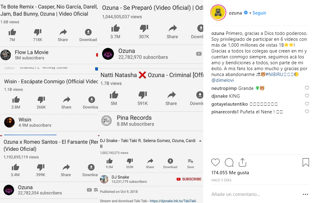 Y hace algunos días, llegó otra buena noticia para el artista. De hecho, rompió un nuevo récord. Ozuna se convirtió en el artista que tiene más videos en YouTube con más de mil millones de visitas.