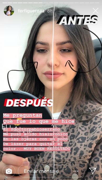 "Me preguntan qué fue lo que me hice. El doctor @pabloserrano me puso ácido hialurónico en las ojeras con un poco de láser para quitar el color. Muy buen resultado", escribió la modelo para acompañar una imagen del antes y el después.