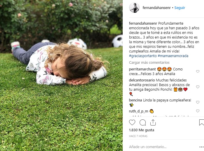Y es por eso que el mensaje de la comunicadora que compartió en su Instagram por el cumpleaños de su hija este 30 de octubre fue muy emotivo. “Profundamente emocionada hoy que ya han pasado 3 años desde que tomé a esta rulitos en mis brazos… 3 años en que mi existencia no es la misma y tiene diferente color… 3 años en que mis respiros tienen su nombre… ¡Feliz cumpleaños, Amalia de mi vida! #graciasportanto #mamaenamorada”, escribió Hansen junto a una foto de su pequeña.